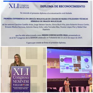 Entre ellas, la comunicación presentada por la Dra. Carolina Castillo, titulada “Primera experiencia en cirugía molecular en cáncer de mama utilizando técnicas híbridas de imagen molecular”, fue reconocida como la Mejor Comunicación Oral del Congreso SEMNIM 2025.