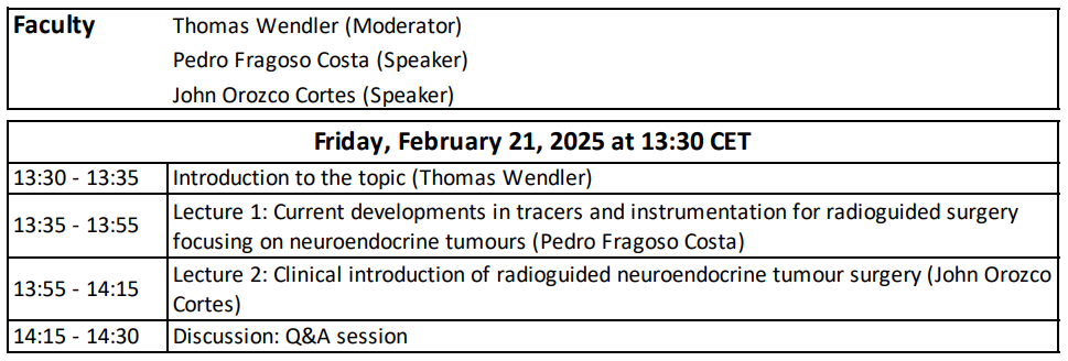 El próximo viernes 21 de febrero del 2025, a las 13:30, tendrá lugar un seminario online sobre cirugía radioguiada en tumores neuroendocrinos (NET, por sus siglas en inglés).