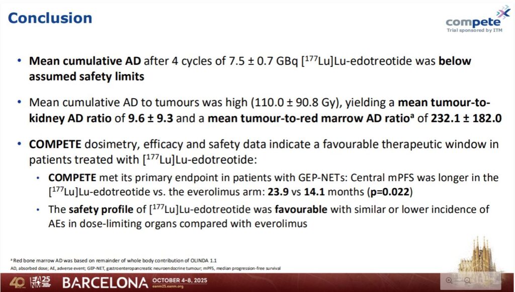Los resultados muestran una mejora significativa en la supervivencia libre de progresión (PFS) con [¹⁷⁷Lu]Lu-edotreotide frente a everolimus (23,9 vs. 14,1 meses; p=0,022), lo que refuerza su valor terapéutico en el tratamiento de los GEP-NETs.
